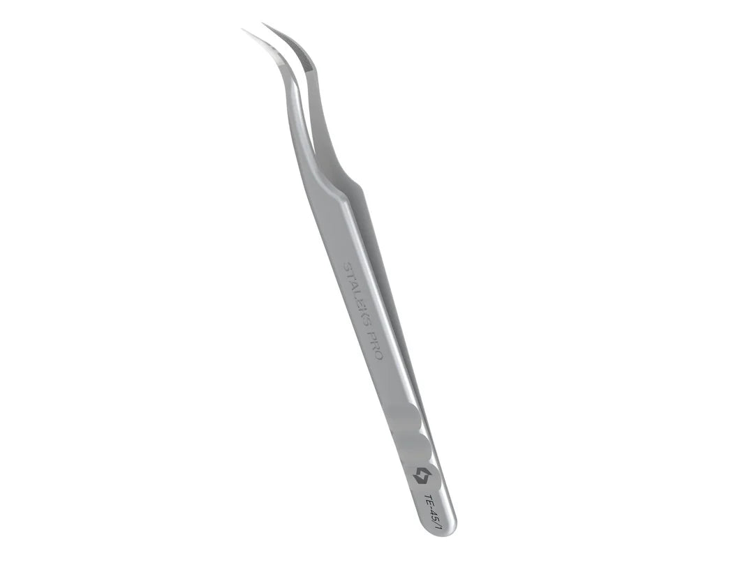 Staleks Pro EXPERT 45 TYPE 1 (curved) eyelash tweezers are designed for precision and professional results. Engineered with fiber tips and curved blades, they feature advanced nano-notches for a secure grip on lashes.